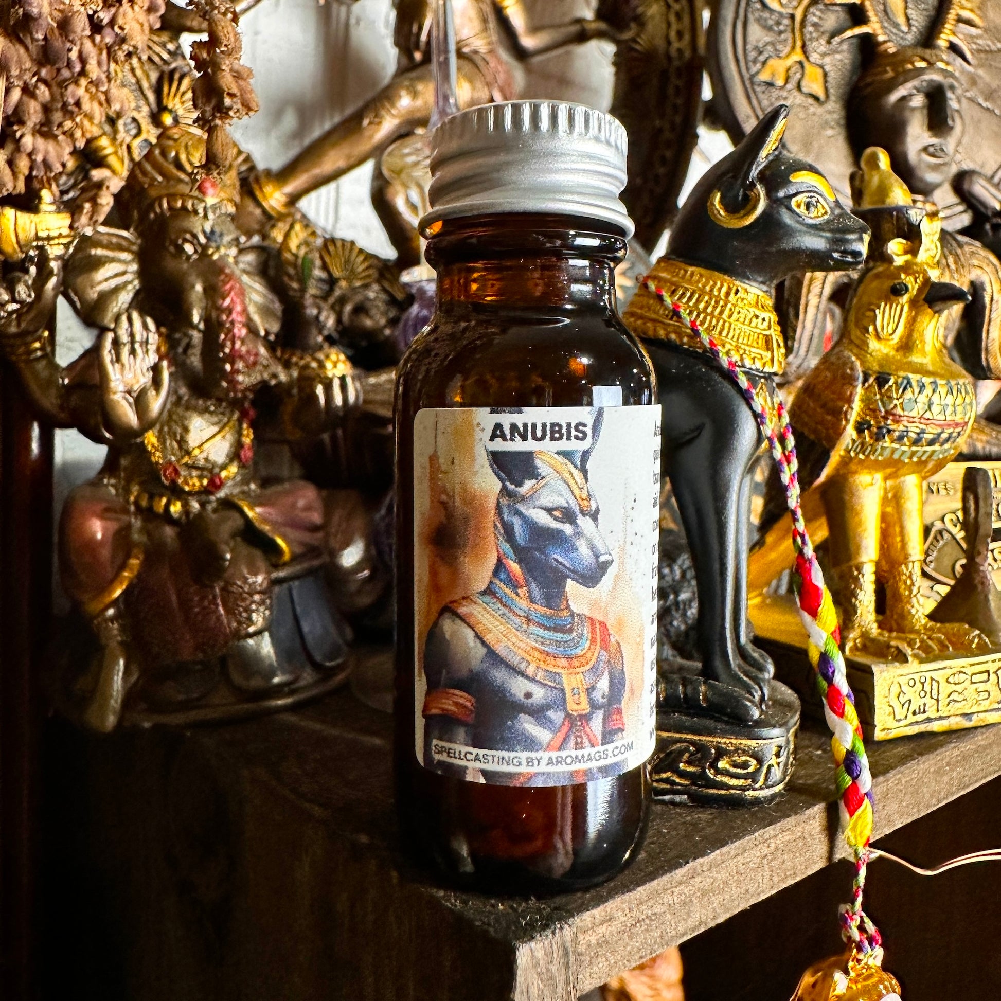 Anubis oil – In magic, Anubis is invoked as a guide through the afterlife, embodying protection, transition, and wisdom. Practitioners call upon Anubis to aid in rituals involving spiritual journeys, ancestral connections, and protection during times of change or uncertainty. Known for his role in mummification and as a protector of graves, Anubis is particularly significant in ceremonies focused on honoring the deceased, facilitating safe passage for spirits, and seeking guidance from the ancestors. His energy is also sought for its protective qualities, ensuring safety and clarity during transformative experiences. By working with Anubis, practitioners aim to tap into his deep knowledge of the mysteries of life and afterlife, fostering spiritual growth, protection, and a deeper understanding of the cycles of existence. Contains: sweet marjoram, frankincense, myrrh, cypress, lemon, and other herbs and essential oils + fine fragrance.