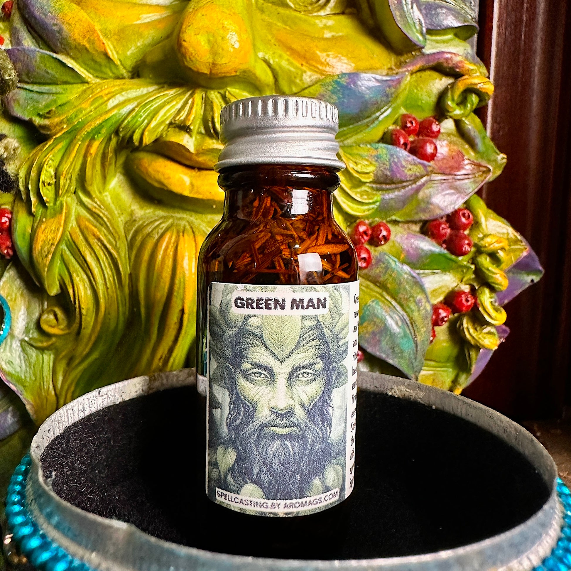 Green Man Oil – In magic, the Green Man is a symbol of nature, growth, and renewal, often invoked to connect with the natural world and its cycles. Representing the spirit of the forest and the essence of vegetation, he is called upon in rituals to enhance fertility, promote growth, and ensure a bountiful harvest. Practitioners seek the Green Man’s guidance for grounding, healing, and rejuvenating their personal energies, drawing strength from the earth’s vitality. His image—a face adorned with leaves and vines—acts as a powerful reminder of humanity’s deep connection to nature. By working with the Green Man, practitioners aim to foster harmony with the environment, harness the life force of plants, and celebrate the ever-renewing cycle of seasons. Contains: petitgrain, eldberry, pine, fir needle, rosemary, lemon, and other herbs and essential oils + fine fragrance.